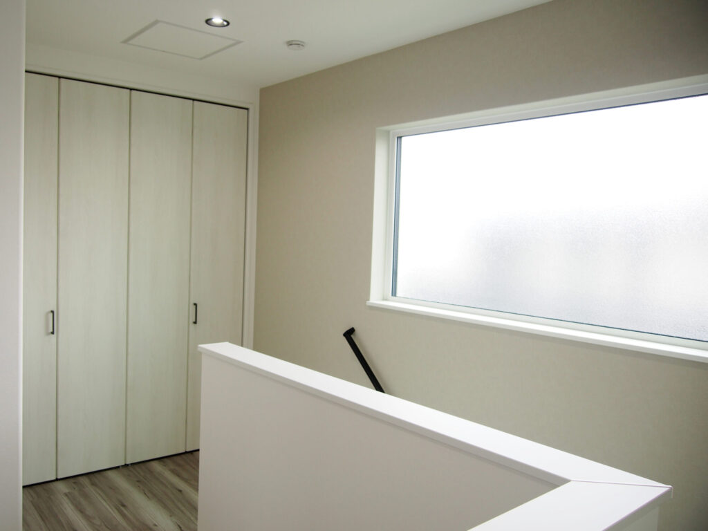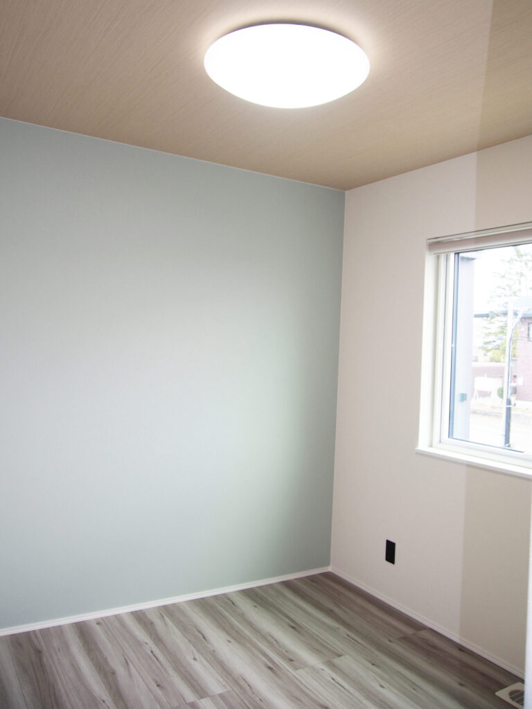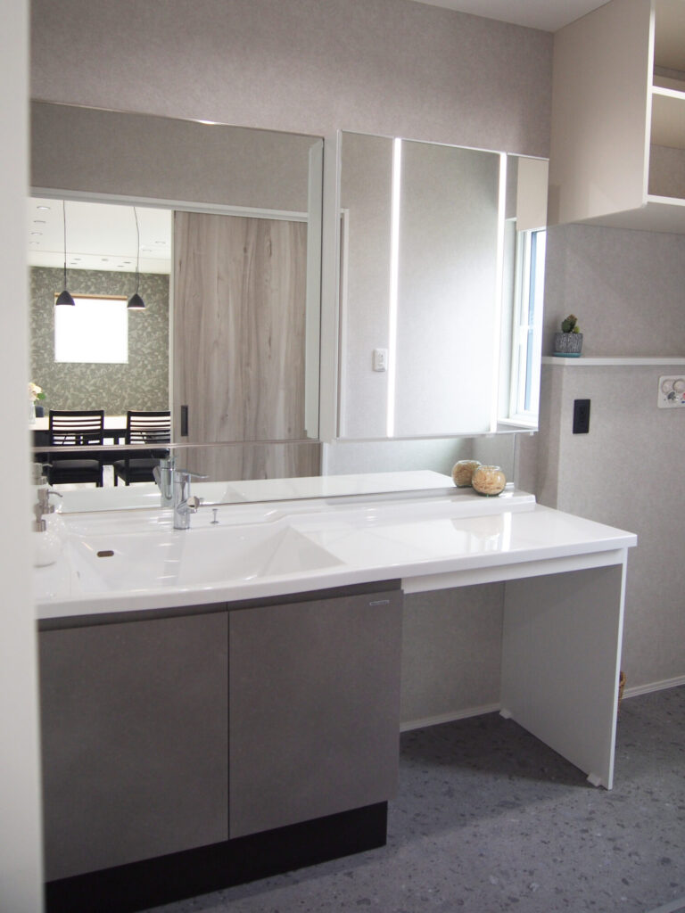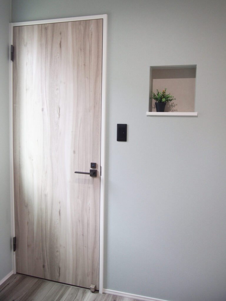 グレージュカラーを意識しクロスや建具を選びました。またトイレや洗面室の床材は和の要素も取り入れ、芦野石柄をチョイス。タタミルームもあることからジャパンディインテリアになるように心掛けました。