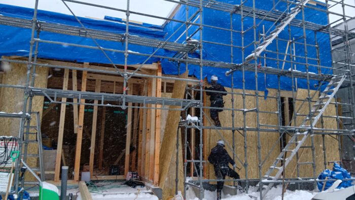 大切な住宅に雪が入らないようにブルーシートで保護します。