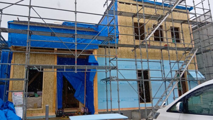 サッシも取付始め、外壁を張る2歩くらい手前でしょうか。