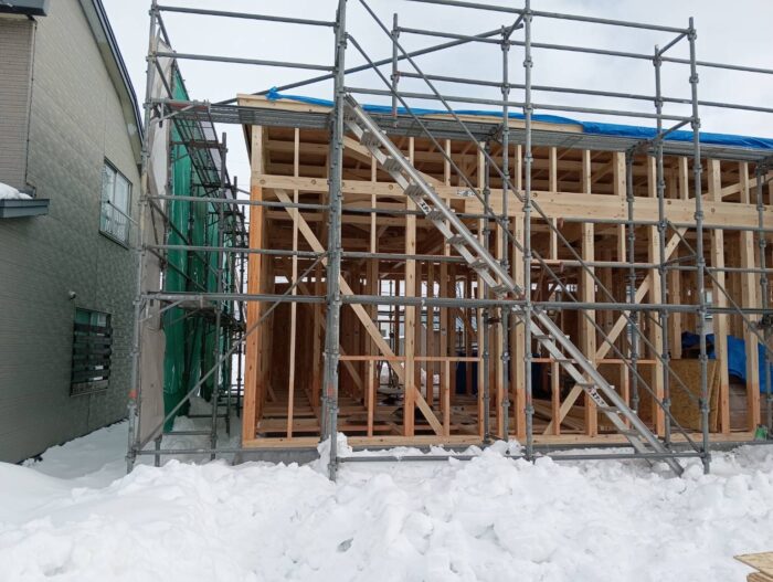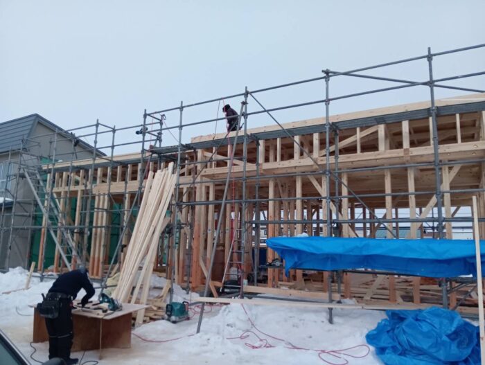数日前は基礎しかなかったのに、もう家の形になりました。