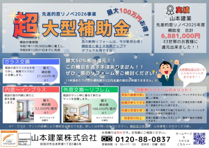 大型補助金でリフォームチャンス!!最大100万円/戸!!
