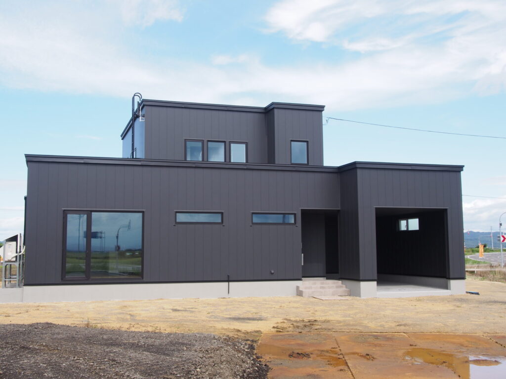 外観はブラックの金属サイディング(アイジー工業:SP-ガルブライト)