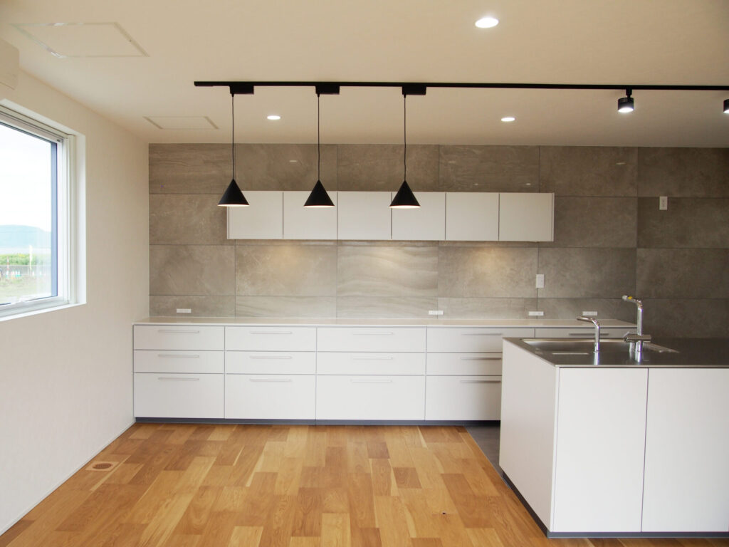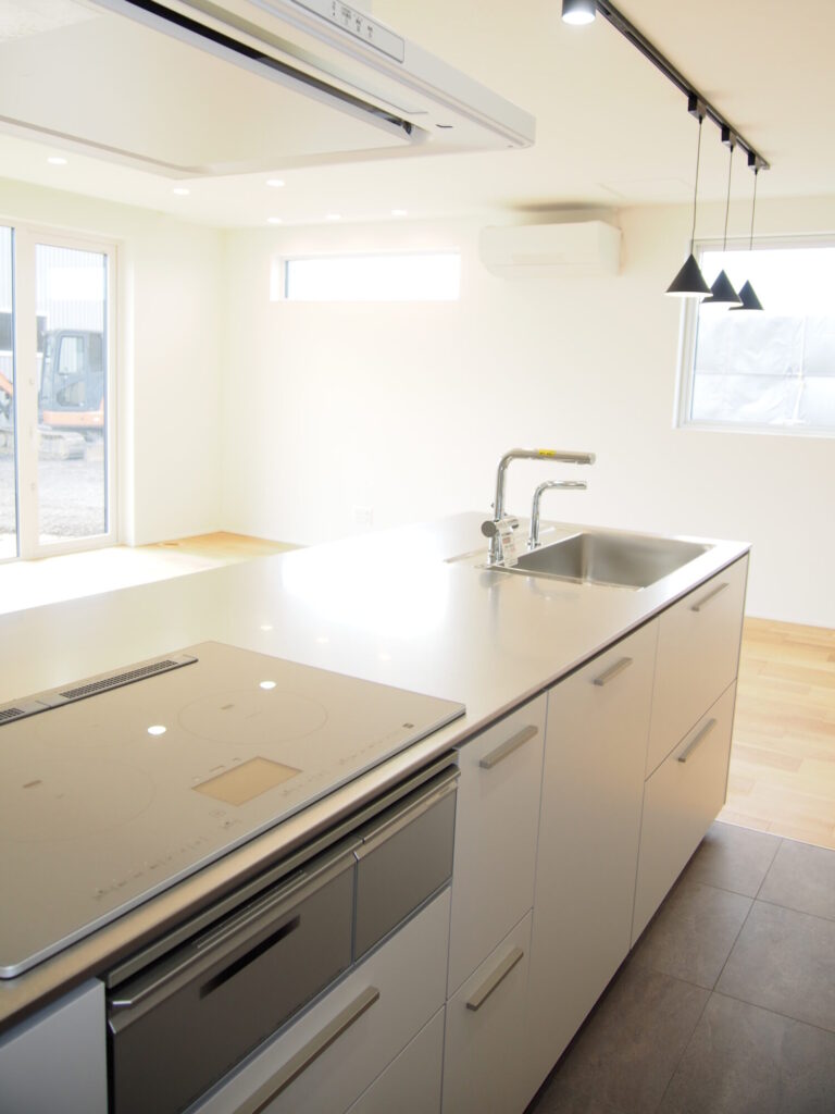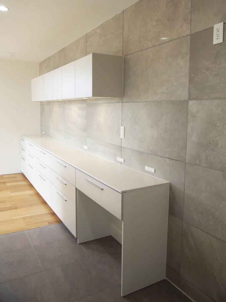 パントリー、キッチン、ダイニングは横並びにし、家事楽動線の間取りにしました。