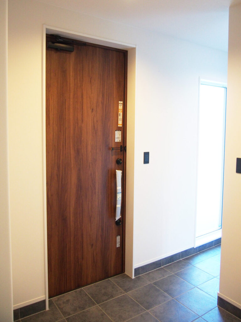 建具は、主にLIXILのラシッサD キナリモダンのソフトグレー。一部にラフィスのハイドア ブラックを使用しています。