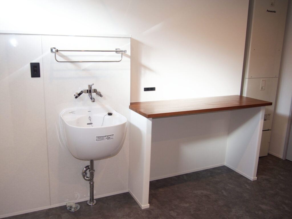 洗濯脱衣室には、ツールボックスのアイアンハンガーパイプや靴などが洗いやすいスロップシンクを設置しました。