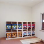 玄関には山本建業からのささやかな贈り物で、乗り物をデザインした収納BOXとシューズ棚が児童をお出迎えします。