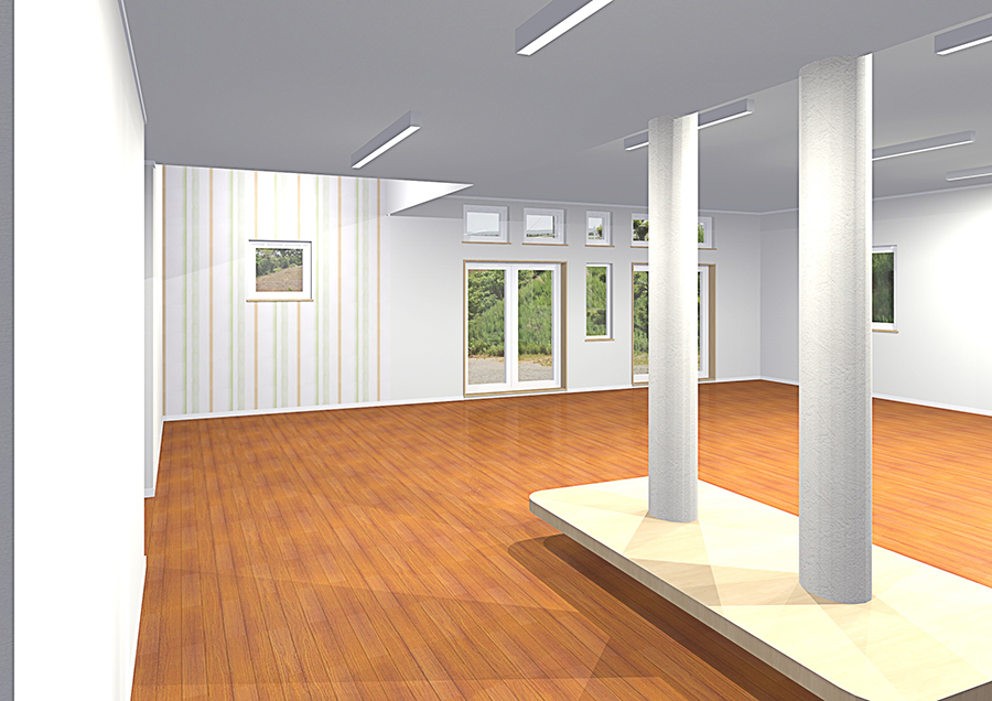 大きな2本の柱を中心に広がる遊戯スペース!静養室の天井は日中は青空、日没は星空に。