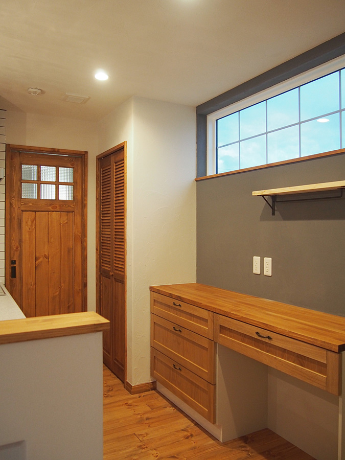 玄関ドアを開けると、ふわっと優しい明かりと共に、無垢材や自然素材に囲まれた空気と、可愛いがいっぱいの住宅です。